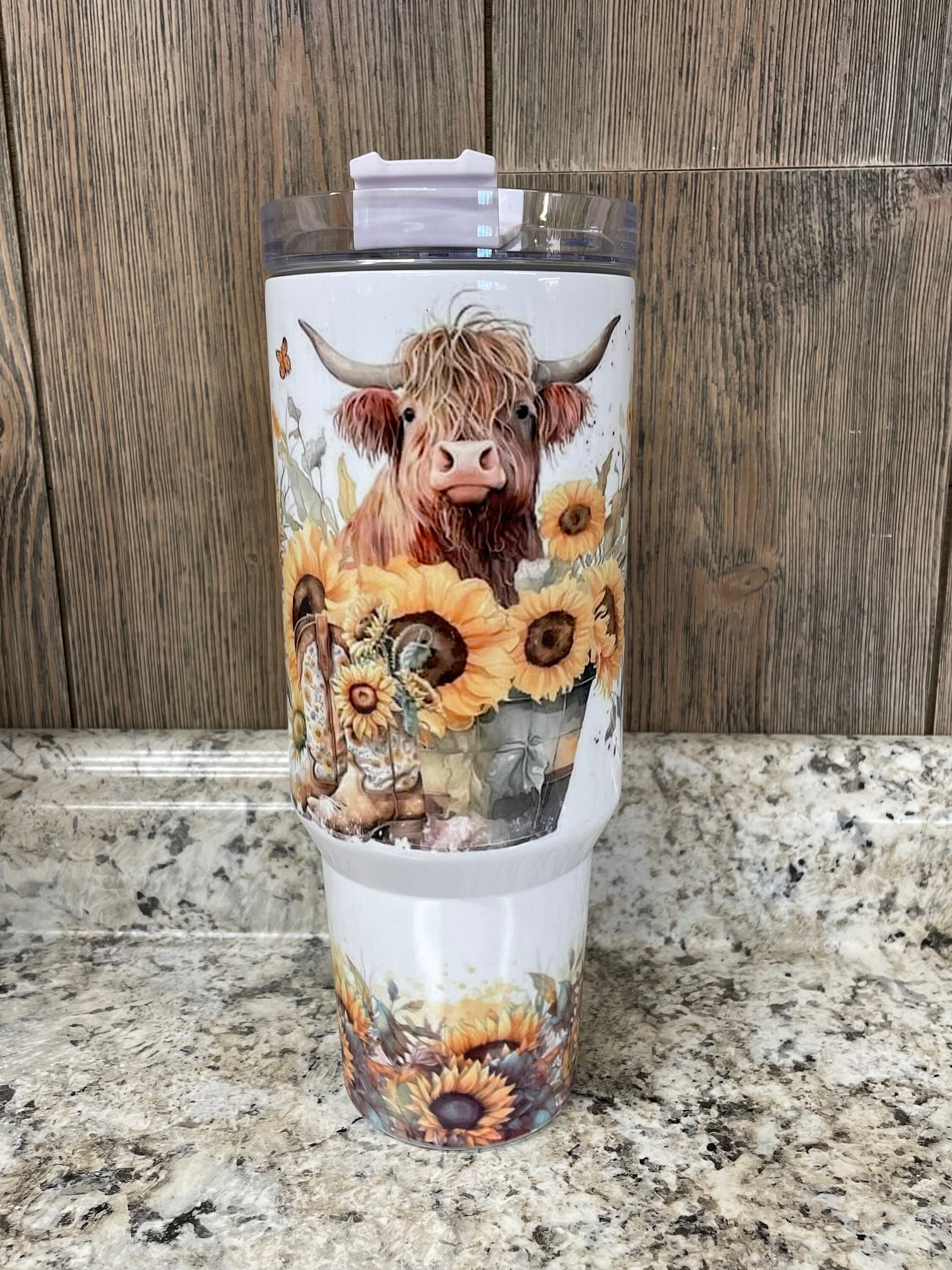 Highlander Cow Sunflower Rustic 40 ounce Stainless tumbler with Handle